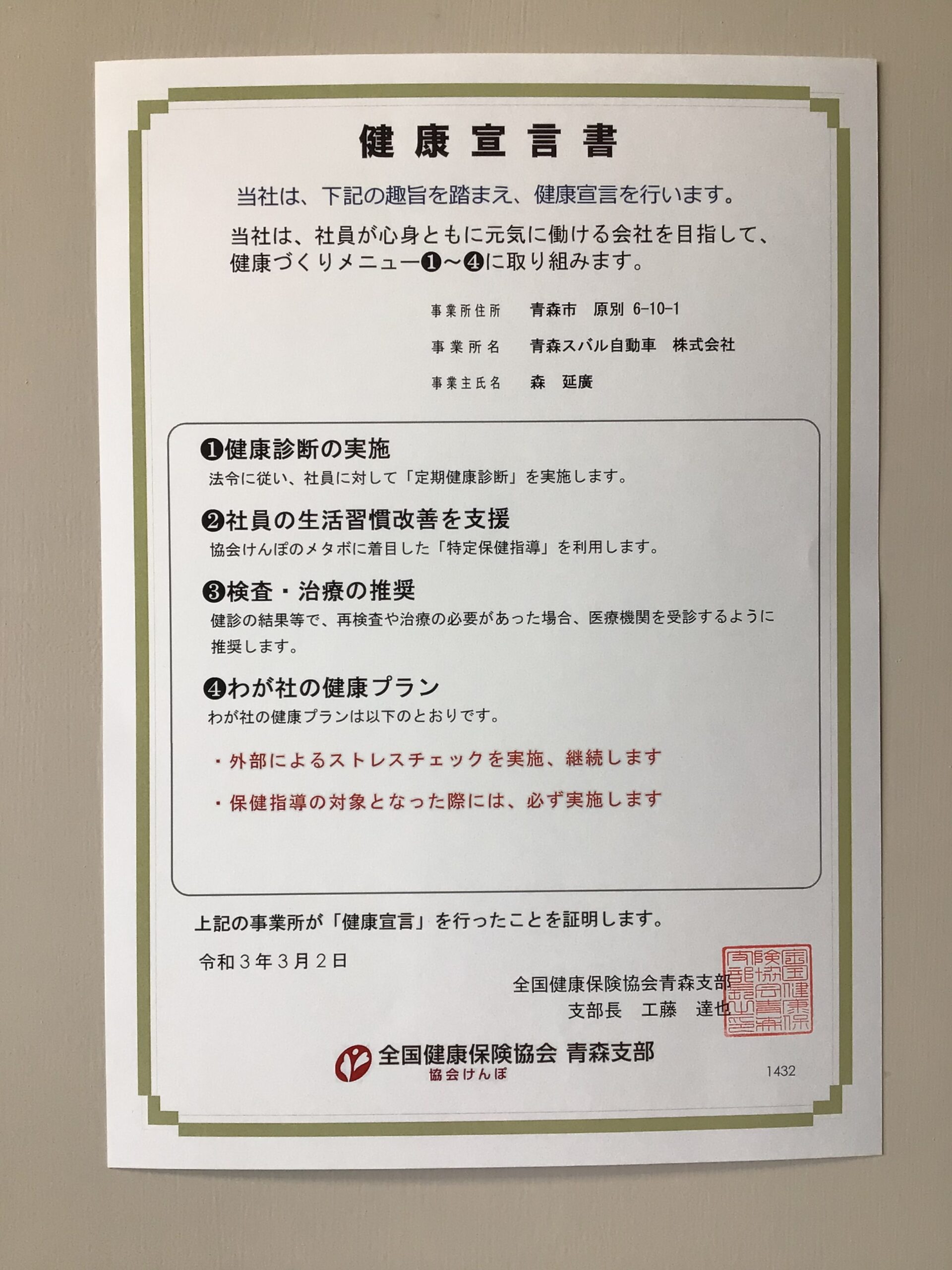 - 協会けんぽ青森支部より「職場健康づくり宣言」認定