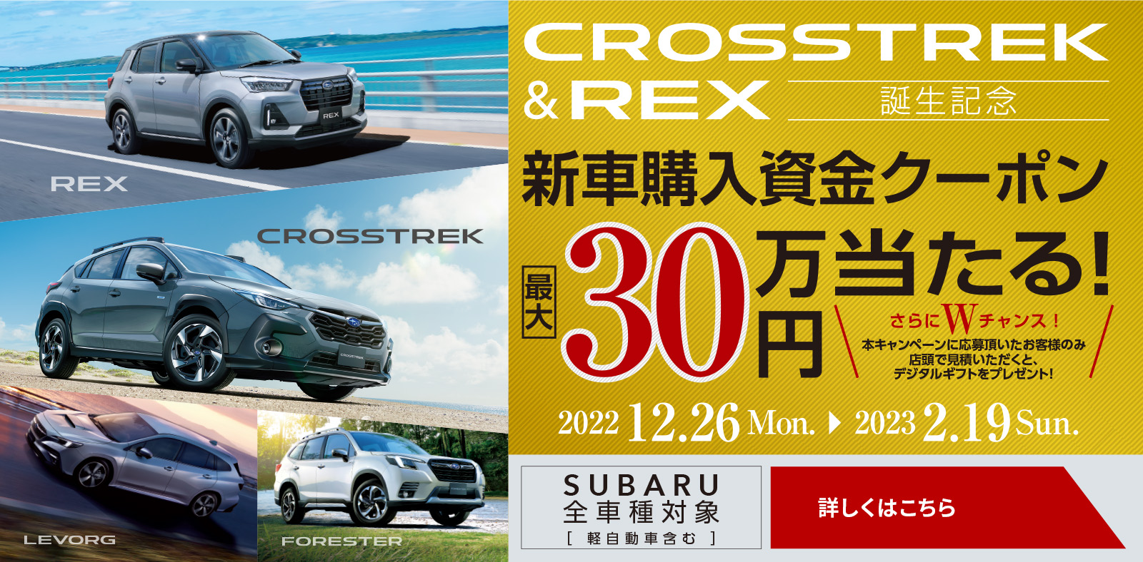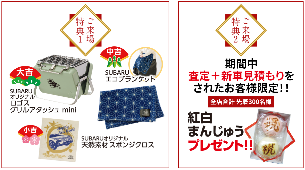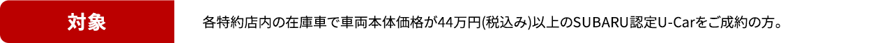 【注意事項】●既にご成約済みの車両にさかのぼって本キャンペーンの適用はできません。●プレゼントは、キャンペーン期間中に対象車種をご成約の上、ご登録いただくことが適用条件となります(登録日の期限はございません)。ご成約いただいた後にキャンセルされた場合は、本キャンペーンの適用はできません。●プレゼントは、申込書にご記入いただいた住所へお送りいたします。宅配便などが確実に届く住所をご記入ください。申込書のご記入内容に不備がある場合、プレゼントの発送ができない場合がございます。●本権利は第三者に譲渡したり、換金や他の商品との交換はできません。●株式会社SUBARUおよびSUBARU販売店の関係者は本キャンペーンの適用対象外となります。●業販、経路販売での受注は本キャンペーンの適用対象外となります。